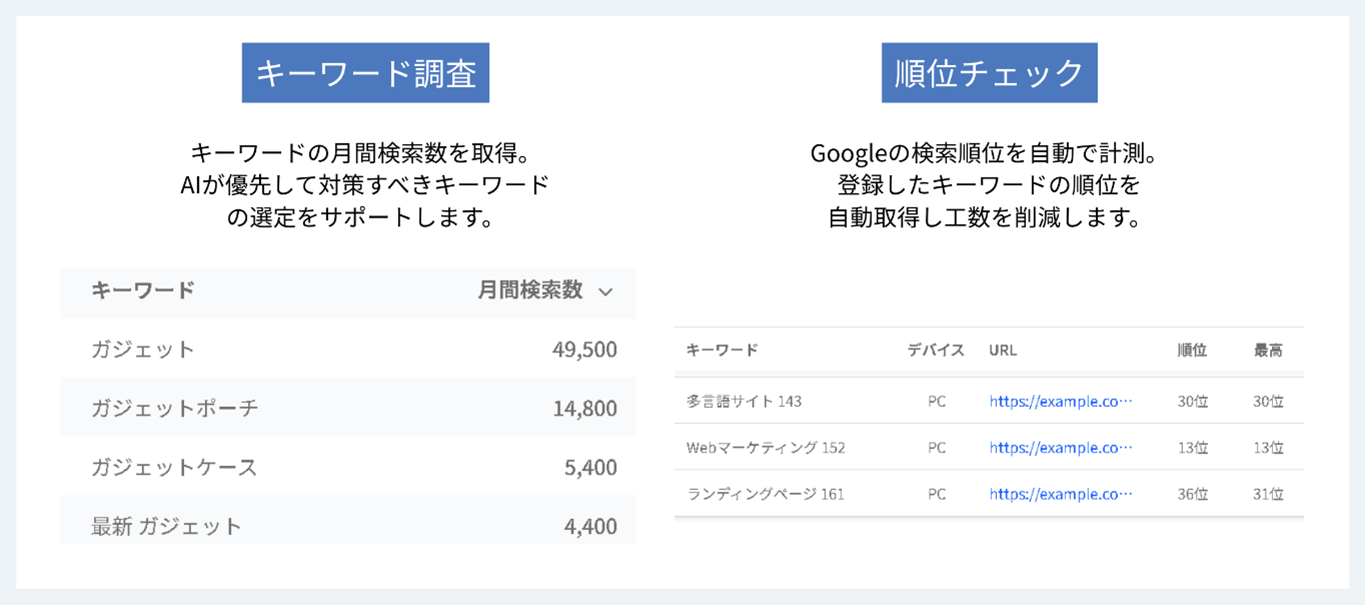 指定したキーワードにおける自サイトのGoogleの検索結果の順位を取得可能。これにより、SEO施策の効果を定量的に測定し、改善点を把握。取得する順位の対象は10位まで、もしくは50位までで選択可能。