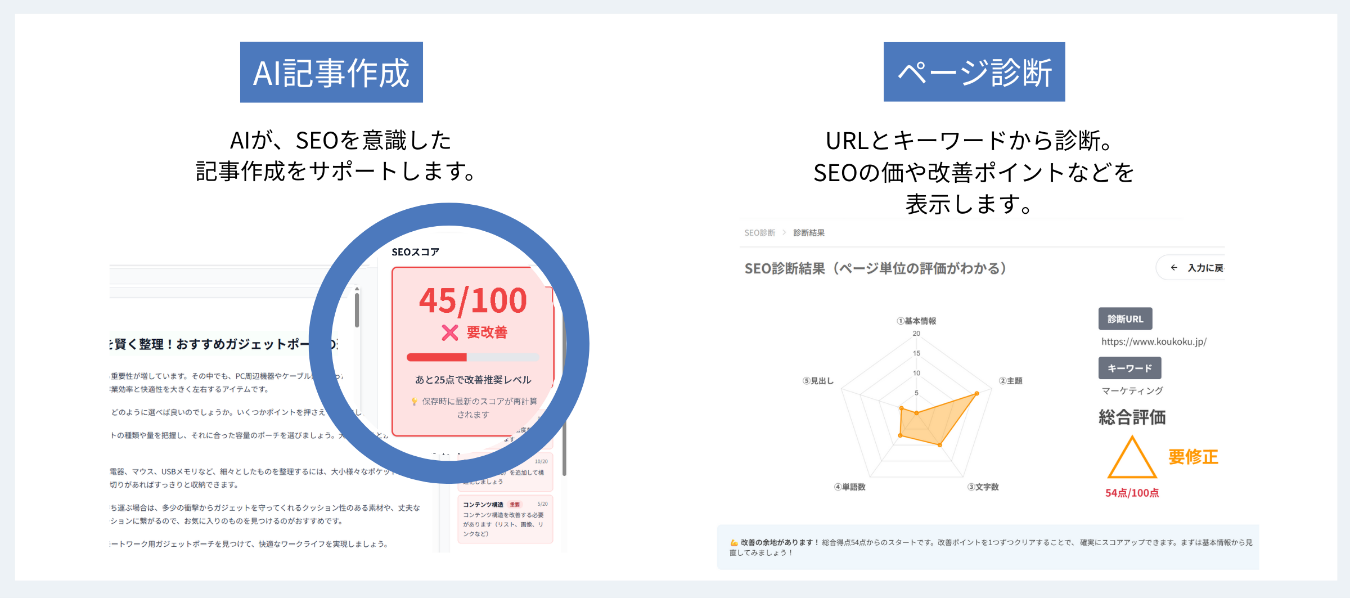 文字数やキーワード含有量など、SEO対策で考慮すべき項目を総合的に評価。これにより、サイトの修正要否を手軽かつ明確に判断可能。