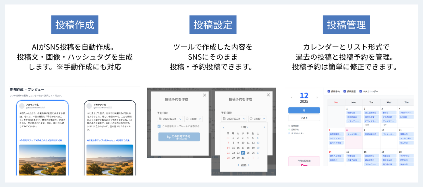 投稿テーマを選択し、キャンペーン情報などを入力すると、その内容をベースに投稿文・ハッシュタグ・画像を生成。エンゲージメント(いいねやシェアなど)を高める文章構成がAIによって自動生成されるため、フォロワー獲得や認知拡大につながる。また、事前に設定したアカウント情報を元にした完全自動生成や、手動作成にも対応。投稿テーマはカレンダー上に365日分の記念日として表示されるため、投稿のネタ探しも不要。