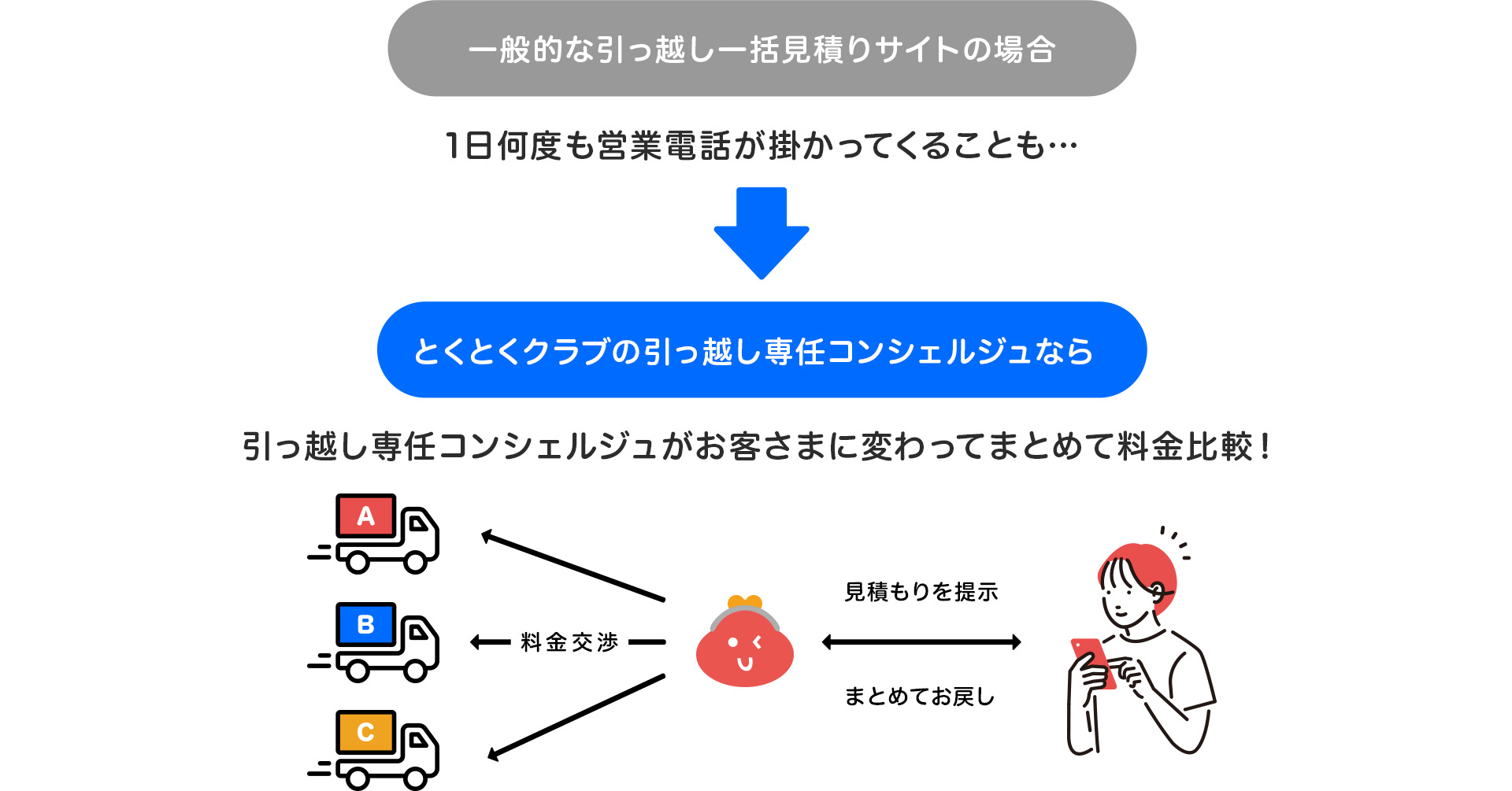 With “Tokutoku Club byGMO,” dedicated staff consolidate moving estimate requests on behalf of members and provide guidance directly via phone. This allows members to smoothly review reliable moving estimates without the hassle.