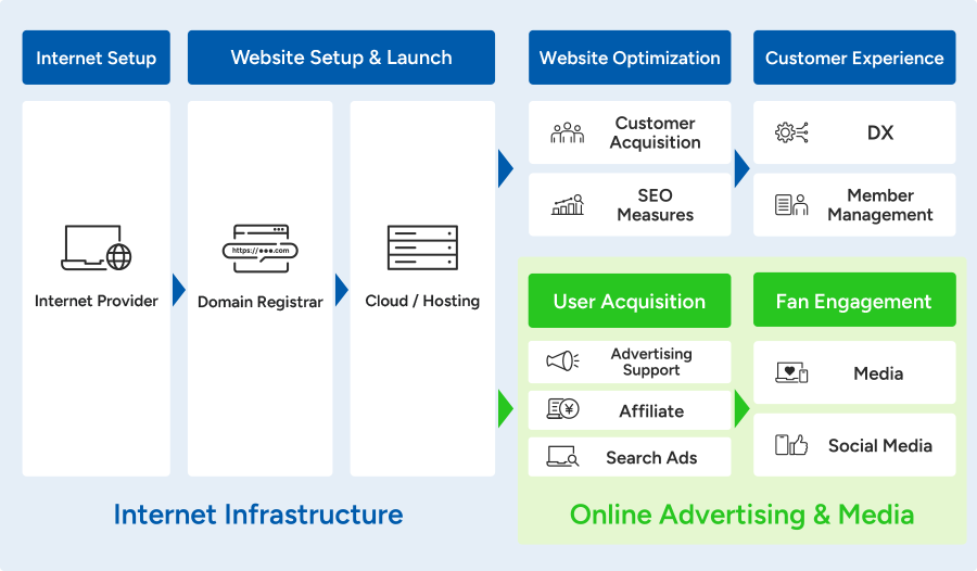 This business area helps individuals and companies get their message out to more people through the power of the Internet. We offer support for attracting and promoting—such as SEO, online advertising, and affiliate marketing. In addition, we provide tools like media platforms and social media services that help build stronger connections between brands and their fans.