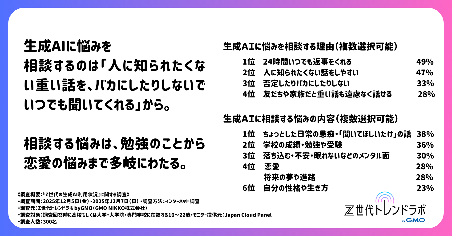 GMOインターネットグループのGMO NIKKO株式会社(※1)(代表取締役社長執行役員:佐久間勇 以下、GMO NIKKO)が提供する「Z世代トレンドラボ byGMO」では、高校生・大学生・専門学校生300人を対象に、『Z世代の生成AI利用状況』に関する調査を実施しました。
