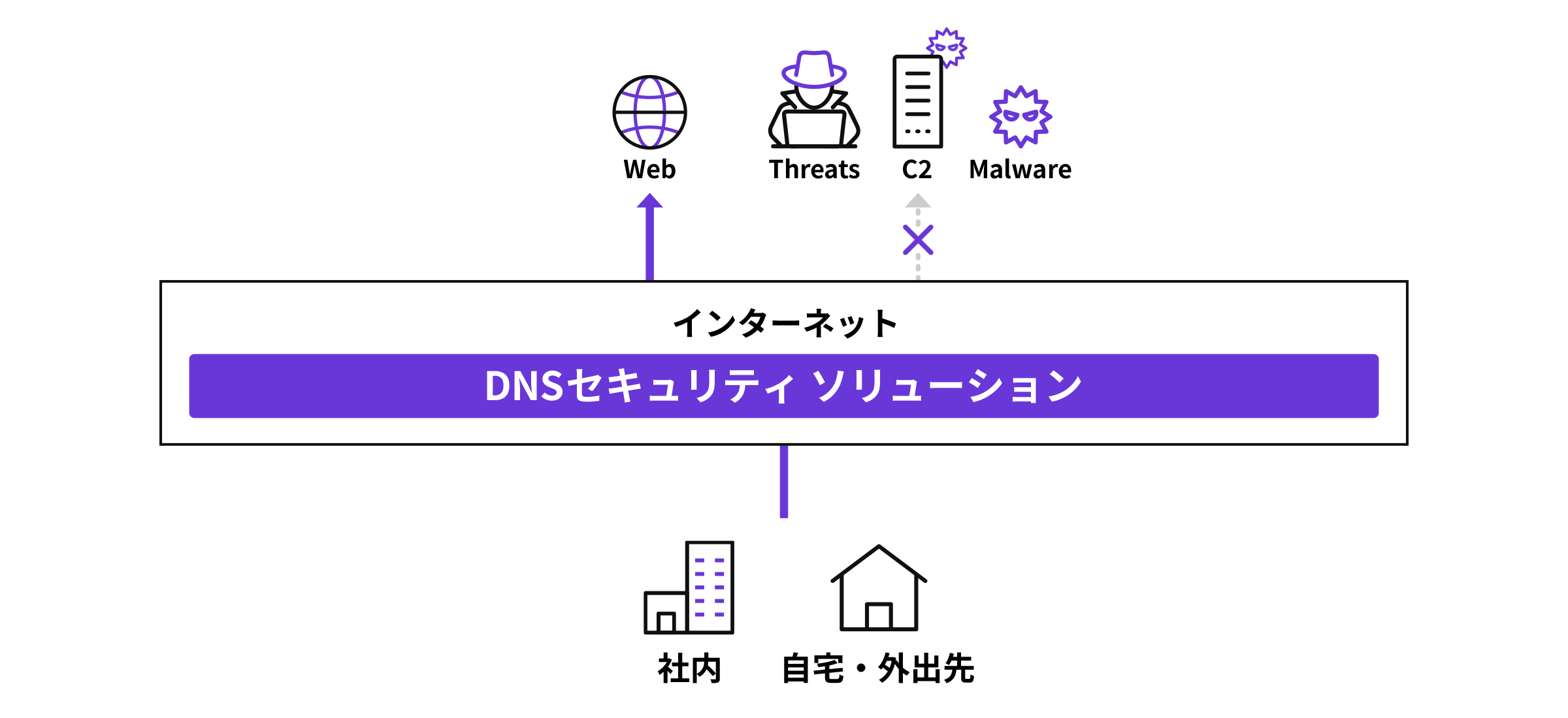 万が一、端末がマルウェアに感染した場合でも、攻撃者が遠隔操作を行うための外部サーバーとの通信をDNSで遮断し、情報の持ち出しや社内ネットワークへの被害拡大を防ぎます。